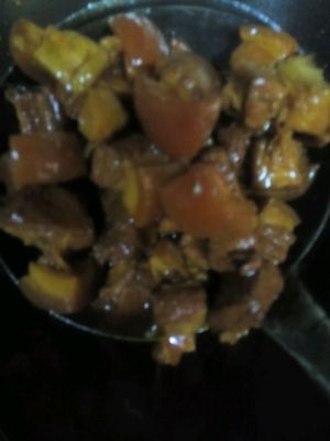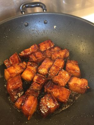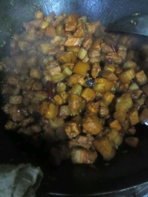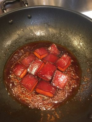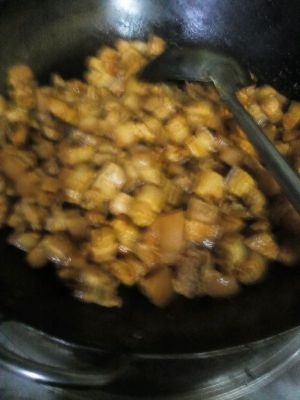这时把肉到入锅中番炒上糖色,加少许老抽或生抽炒,再到入一些料酒去腥