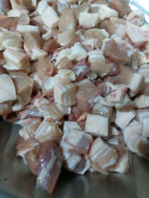 精选五花肉半斤,切成大的方块,弄两个土豆切滚刀块,泡入水中备用