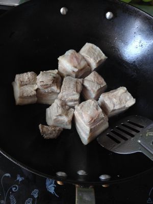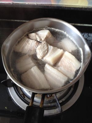 水开后 焯水4~5分钟即可,然后捞出过冷水清洗,尤其是肥肉那面,会有油脂,可以不锈钢勺子刮掉。沥干,锅中不放油,肥面朝下,小火。
