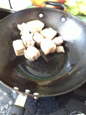 肉洗净切块,热油锅,放少许油,下姜片爆香,后放肉,炒至肉有点发黄