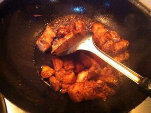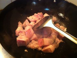 转成小火加热到糖呈现焦糖色且冒泡泡后放入肉块翻炒,同时把火转回中火 怕被油溅到的朋友带一个长筒的胶皮手套,这一步还是很有风险的……
