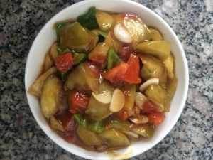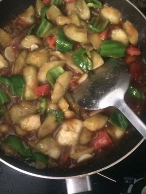 热油,放入粘了淀粉的茄子,炸至金黄色捞出,在剩下的油里(如果油多,可取出一部分),放入蒜片,西红柿,炒出香味,再加入茄子,辣椒搅拌,稍后放入之前准备的调汁,煮一会就可盛盘了