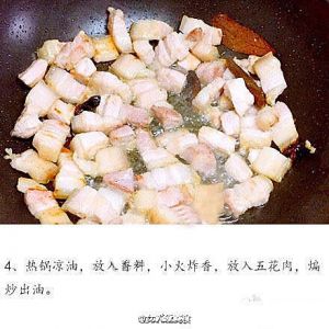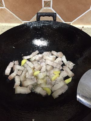 同样热锅凉油(此时的油用刚才的葱油)放入五花肉翻炒。油不用放太多,因为在翻炒肉的过程中,五花肉里的油脂会被炸出。