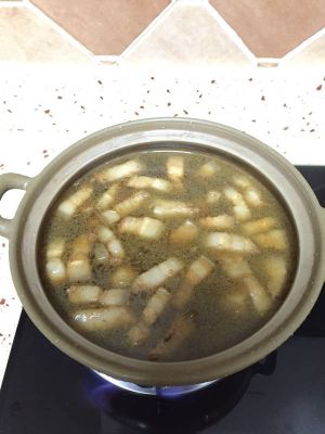 水开后放入焯好水的五花肉,加入料酒、生抽、老抽、蚝油