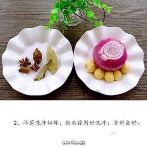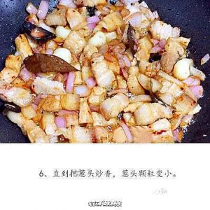 五花肉炒好放入香菇和炒好的洋葱酥 煮熟的鸡蛋加水 老抽 生抽 米酒 冰糖 五香粉 一点点黑醋 等水开转小火 炖至软烂