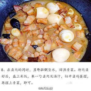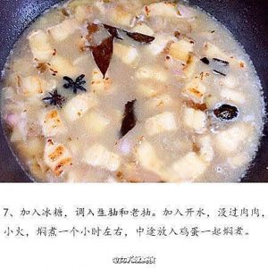 翻炒1分钟左右放入少量冰糖(冰糖会使菜肴变得油亮)、生抽(生抽的量根据自己口味放入,但记住这道菜不用放盐,所以可比平时多放些)、老抽(为了提色放入老抽,半茶匙即可)、八角、煮熟的鸡蛋去皮。最后倒入水,把肉没过即可。先开大火,烧开后转小火炖煮1小时左右(但也要根据肉量来定)。汤汁要保留一点!