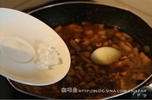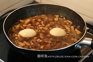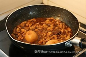 加入适量的水,放入水煮蛋,中小火慢炖45分钟,加入洋葱酥,大火收汁