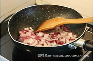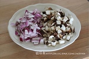 锅热后放入少量的油,再放入洋葱丁翻炒出香味