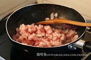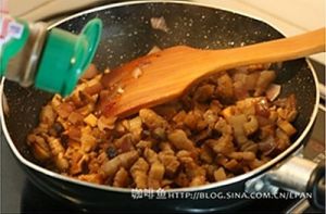 将切成1厘米大小的五花肉放入锅内翻炒,五花肉出油