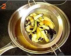 放花生油炸茄子,油也不用太多,适当翻一下,炸完后用清水把油茄子冲洗一下。