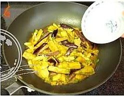 锅里放花肉,煎一会,主要是煎过后会香一点。不要炸成金黄色,会太干太硬。