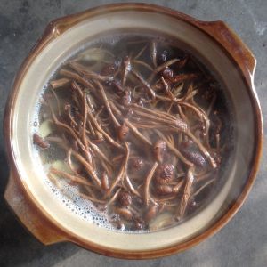 排骨洗干净先飞水放两片姜【冷水下锅煮两分钟】然后捞起来洗干净备用,五指毛桃,赤小豆,薏米,白茅根洗干净备用。