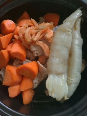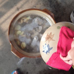 炖煮1个小时左右,放入山药段 继续炖煮1个小时,汤成白色即可!