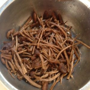 茶树菇泡发洗干净,把根部用刀切掉,这里有个小建议,可以先把茶树菇根部剪掉再洗洗就可以了,以免把茶树菇的营养都流失了!