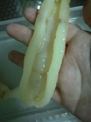 这个是已经泡发好的了,泡发口述一下吧,很简单。烧一锅姜水,烧开后,把干的花胶丢进去焖上,中间不要打开,自然冷却。然后拿出变软去腥后的花胶剪开,洗去血腥和筋膜。纯净水泡在容器里面放冰箱冷藏2_3天,你会看到花胶自然涨发。如图。