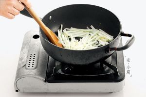 锅中倒油,放入葱花和蒜片煸炒出香味,加入胡萝卜丝翻炒稍微变色