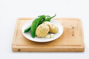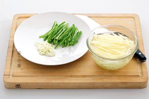 土豆刮皮,洗净后切成粗细均匀的丝,泡在水中,这样可以避免变黑,也可以去掉其中的淀粉,炒之前捞出沥干。绿尖椒去籽、去蒂,切成与土豆丝相仿的丝。蒜切成片。