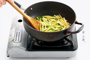 加入土豆丝翻炒变软后, 加入生抽翻炒