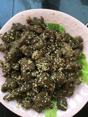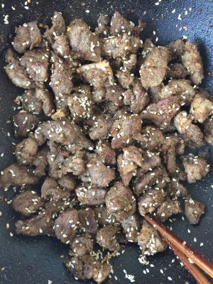炒至羊肉颜色呈煎黄色后,放入孜然、白芝麻、辣椒粉、盐继续翻炒入味。
