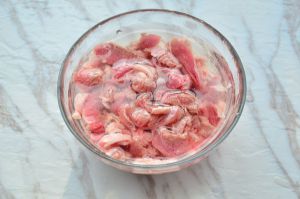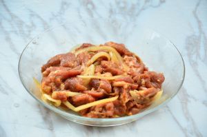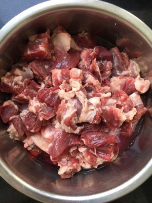 生羊肉切碎,大概一枚一元硬币大小。然后用一勺盐,一勺黄酒,生姜丝,大葱丝,搅拌均匀。腌制半小时。