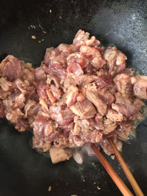 再起锅,油热后倒进羊肉,开炒。