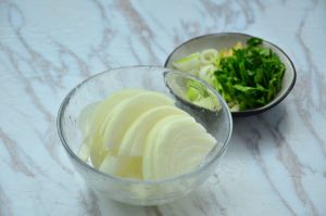 将洋葱切细丝,备好葱花姜丝,香菜切小段备用