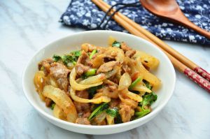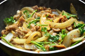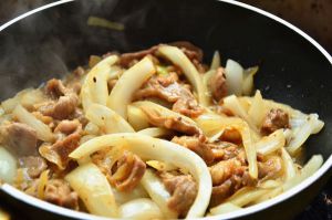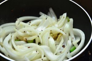 加入葱花姜丝炒香,将洋葱丝加入,翻炒至洋葱断生