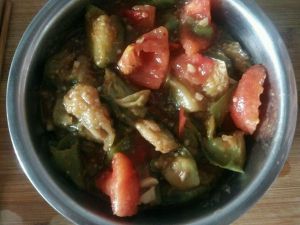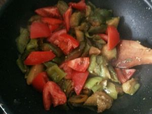 热油,把油放多点,把茄子尖椒一起炒,顺便加调料,盐,鸡精,花椒粉,生抽少许,姜粉……等八成熟了加西红柿