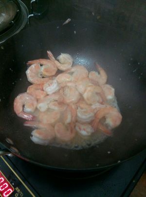 4 热锅 倒油 炒菜的量就行了倒入大虾炒 慢慢翻炒 全部变色了倒容器里