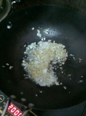 先放入姜,蒜,爆香,紧跟着放入大虾不断翻炒,然后放入葱,四种调料!不断翻炒!炒啊炒,炒啊炒,炒到全部变色!