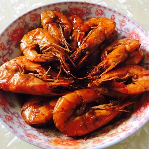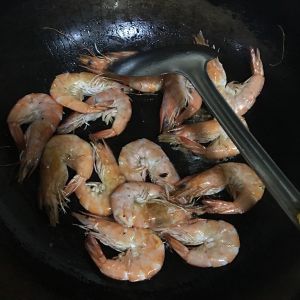 锅中放油,虾下锅,待虾两面变红用铲子压下,出红油,虾盛出,油留下。