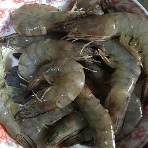 新鲜大虾剪掉虾须,后背剪开去掉泥肠,加少许盐、姜片和料酒腌制大概20-30分钟。
