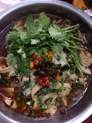 再快速放入鱼片,煮熟捞出放入碗中,锅中放油,冷油时放胡椒花椒干辣椒八角,炸黄淋在肉片上,放上香菜,完工