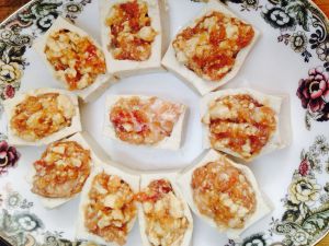步 骤: 1、虾去壳去内脏,剁碎,加入盐、香油、绍兴酒、1.5匙淀粉、白胡椒等搅拌均匀