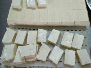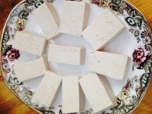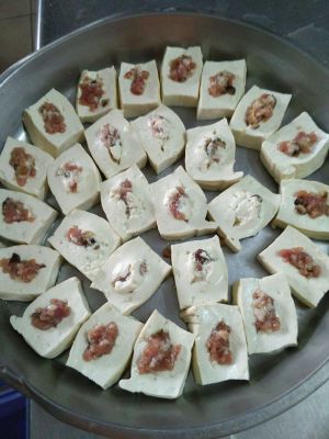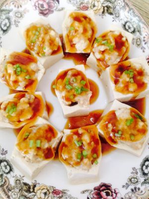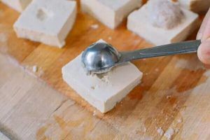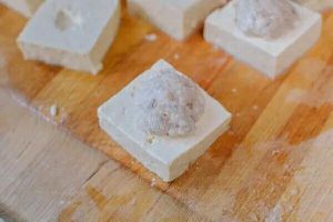 2、取出嫩豆腐,排出多余的水分,切块,朝上的一面轻轻地用勺子挖一个小坑用来放虾肉,舀起虾肉末,蘸取淀粉后置于豆腐上。