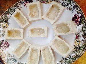 用不锈钢小勺子柄,挖掉豆腐中间部分,注意不要挖掉底