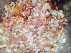 挖掉的豆腐中间部分放在肉馅里,再加入一勺生抽、2g盐、1/2鸡蛋液搅拌均匀