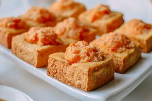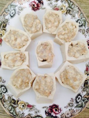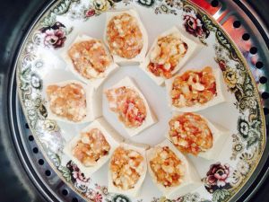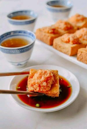 材 料: 豆腐、半斤虾、1.25茶匙盐、1茶匙香油、半匙绍兴酒、1.5茶匙淀粉、新鲜的白胡椒粉、2汤匙生粉、4杯油、 蘸酱:1茶匙糖、1汤匙生抽、¼茶匙黑酱油、葱花