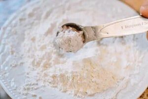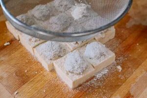 3、虾肉球都备好后,用筛子筛出玉米淀粉撒在酿豆腐上。