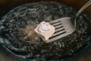4、热油,将酿豆腐轻轻放入油锅中,炸至金黄色即可起锅。