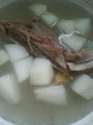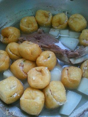 传统酿豆腐煮法是关键,必须有鸡汤或骨汤煮(改良的只是上锅蒸熟就吃,味道不鲜)我今天备了一块猪扇骨配上白萝卜熬汤,熬半小时出味后才将酿好的豆腐放下。