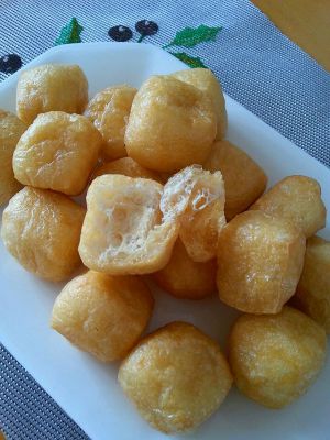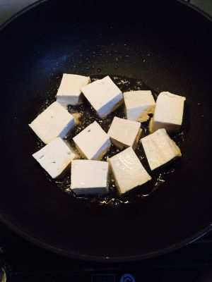 锅中倒油,油热后将豆腐放入。用小火慢慢煎至金黄色后翻面。双面煎好后捞出沥油备用。