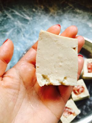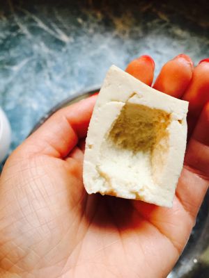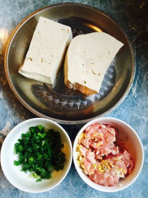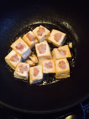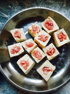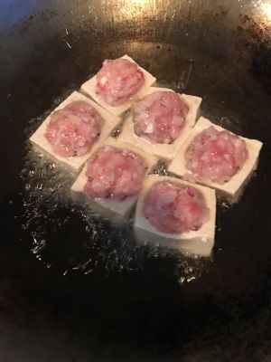 豆腐切小块(大小自己定),用勺子将中间挖洞后把准备好的猪肉馅塞进去。(注:不要将豆腐挖穿三分之二就好)