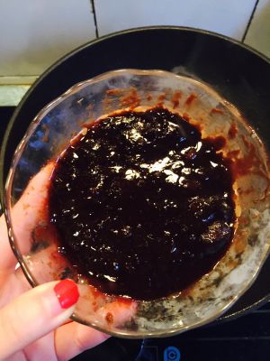 倒入自制酱两汤匙(黄豆酱、甜面酱、海鲜酱、蚝油:1:1:0.5:0.5,据说是用来做凉拌菜挺好,也是网上学到的)