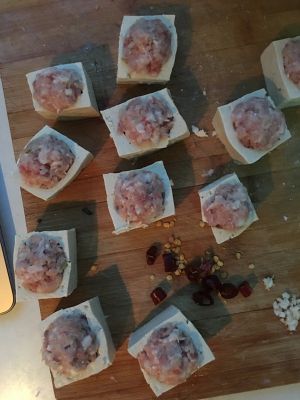 豆腐每酿满一个就要将切开的豆腐口那块盖上封口(见图那样,传统做法就必须是这样,改良版就整个豆腐对半切开来酿的)