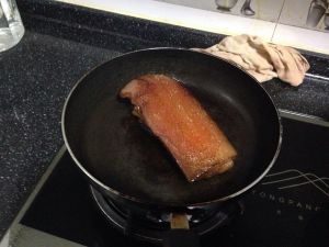 买的正方形五层腩肉,首先五花肉冷水入锅煮,加几片姜,料酒,少许白醋(炸皮时颜色会漂亮)去肉腥味,中火煮大约20分钟熟透拿出来用厨房纸吸干水份,趁热抹上一点老抽后用针扎满猪皮孔,用蒸架架住扣肉放入雪柜晾干!(也可以提前一天做放在雪柜风干)赶时间就厨房纸吸干水份直接去炸,不够干炸起来油溅的特别厉害,哈哈