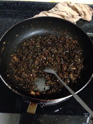 用煎过猪肉剩下的油将梅菜炒好。因为某人不吃辣所以没有放辣椒只放了盐和生抽。之前煮猪肉时盐放的不够所以梅菜稍微放的咸一些。