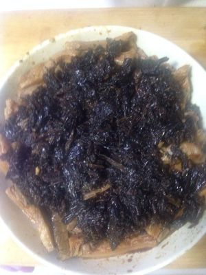 葱、姜爆出香味后放入泡好的梅干菜继续翻炒,同时加入盐和糖各一勺,翻炒两分钟后挑出葱、姜装盘备用。