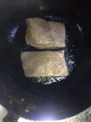 五花肉彻底冷却后拿出,用纸巾把水分全部吸干,(否则再煎的时候油会溅的到处都是)锅中放适量的油烧热,将五花肉皮朝下放入锅中煎。
