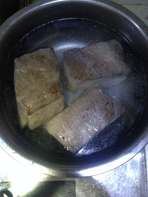 煮好以后将五花肉捞出放入冷水中浸泡。把锅中的姜片捞出来剩下的汤可以当高汤使用。